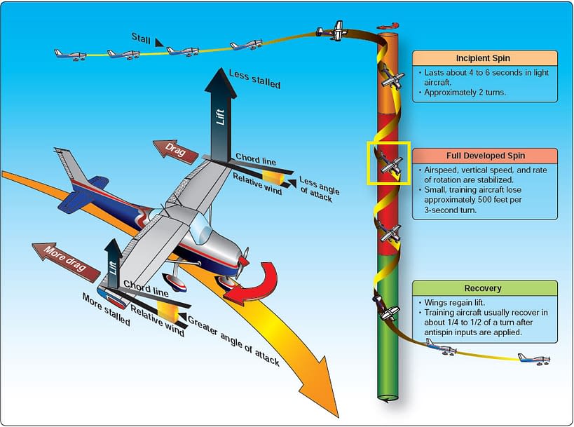 A spin is an aggravated stall that typically occurs from a ‘full stall’ occurring with the aircraft in a yawed state and results in the aircraft following a downward ‘corkscrew‘ path. As the aircraft rotates around a vertical axis, the outboard wing is less stalled than the inboard wing, which creates a rolling, yawing, and pitching motion. The aircraft is basically descending due to gravity, rolling, yawing, and pitching in a spiral path. The rotation results from an unequal AOA on the aircraft’s wings. The less-stalled rising wing has a decreasing AOA, where the relative lift increases and the drag decreases. Meanwhile, the descending wing has an increasing AOA, which results in decreasing relative lift and increasing drag.